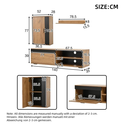 Matériau : Panneaux de particules de haute qualité, - Dimensions hors tout : Meuble TV 140 x 35 x 39 cm - Meuble Mural 52 x 28 x 77 cm - Etagère Murale 78,5 x 13,5 x 8 cm. Capacité de charge de 40 kg