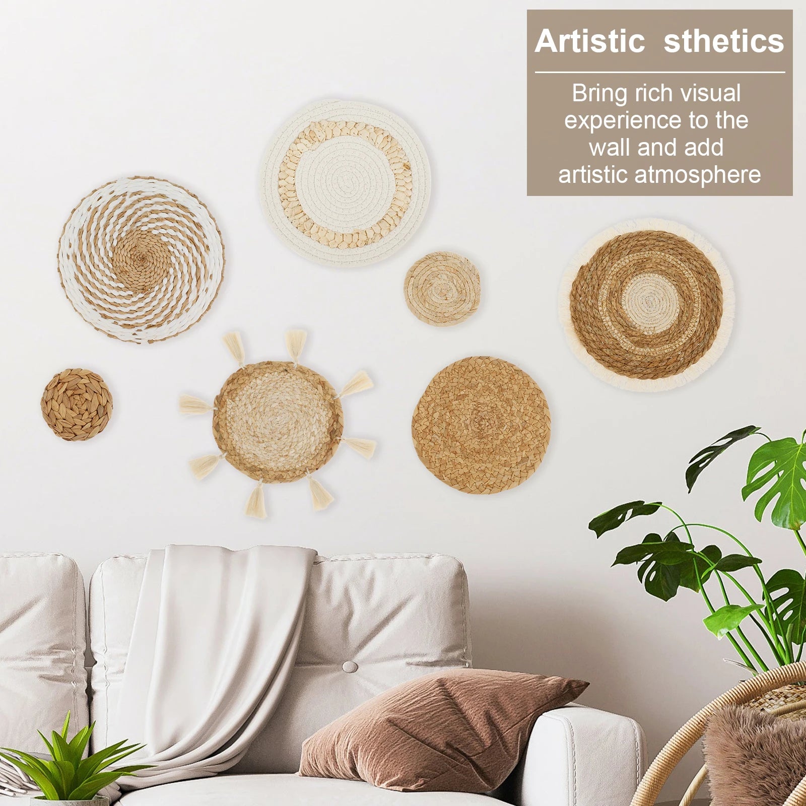 Apportez une touche naturelle, chaleureuse et bohème à votre intérieur avec cet ensemble de 7 paniers muraux tissés en rotin et osier, entièrement faits à la main. Leur design rond et leur tissage authentique créent une décoration murale unique, parfaite pour sublimer un salon, une chambre, une entrée ou un espace de style farmhouse. Créez une ambiance chaleureuse et authentique avec cet ensemble de 7 paniers muraux tissés en rotin et osier, parfait pour une décoration bohème et naturelle. Leur tissage artisanal met en valeur la beauté des fibres naturelles tout en ajoutant texture et caractère à vos murs.