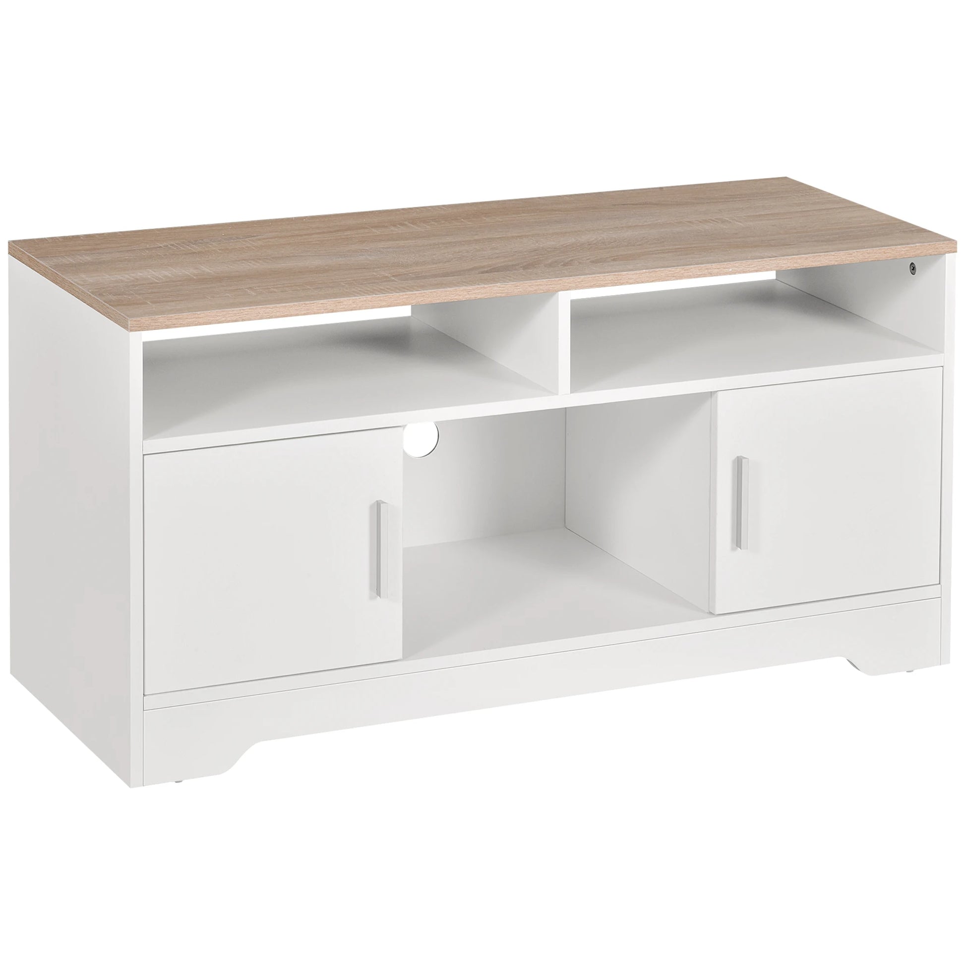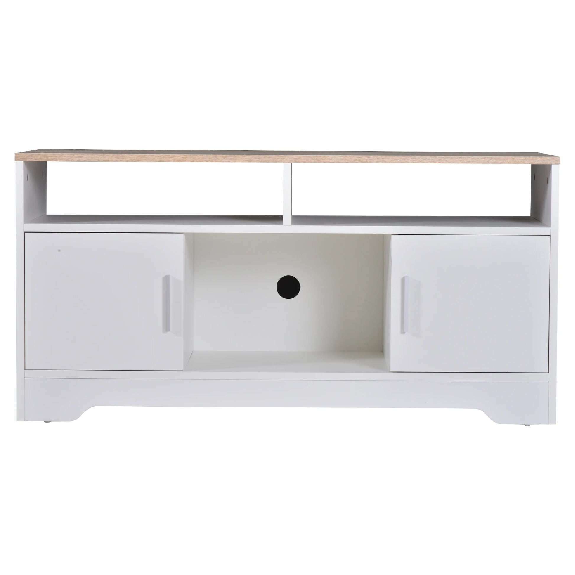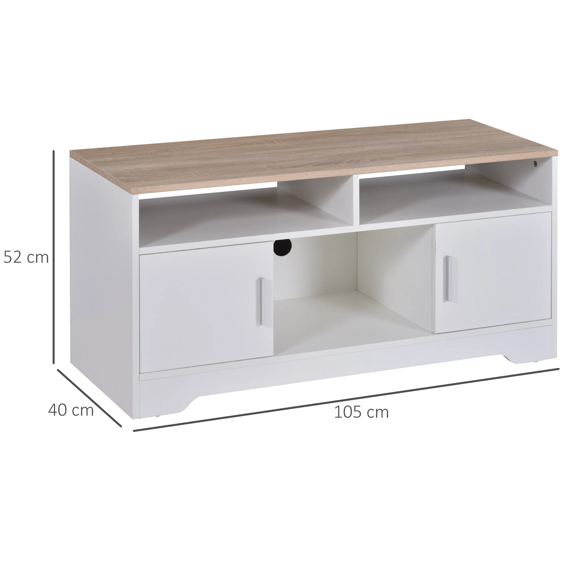 Apportez élégance et praticité à votre salon avec ce meuble TV moderne conçu pour accueillir des téléviseurs jusqu’à 65 pouces. Sa large surface supérieure est idéale pour poser votre écran et vos accessoires multimédias. Les compartiments ouverts permettent de placer consoles, lecteurs ou box internet, tandis que les tiroirs fermés offrent un espace discret pour ranger télécommandes, piles, jeux de cartes, carnets et autres objets que vous souhaitez garder hors de vue. Grâce à ses 2 trous passe-câbles, vous profitez d’une installation propre et organisée, sans fils apparents. Ses pieds en bois de caoutchouc assurent une stabilité optimale et ajoutent une touche naturelle à son design contemporain.