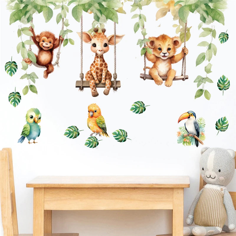 - Singe, girafe, lion et oiseaux sur balançoires, déco chambre enfant, PVC -