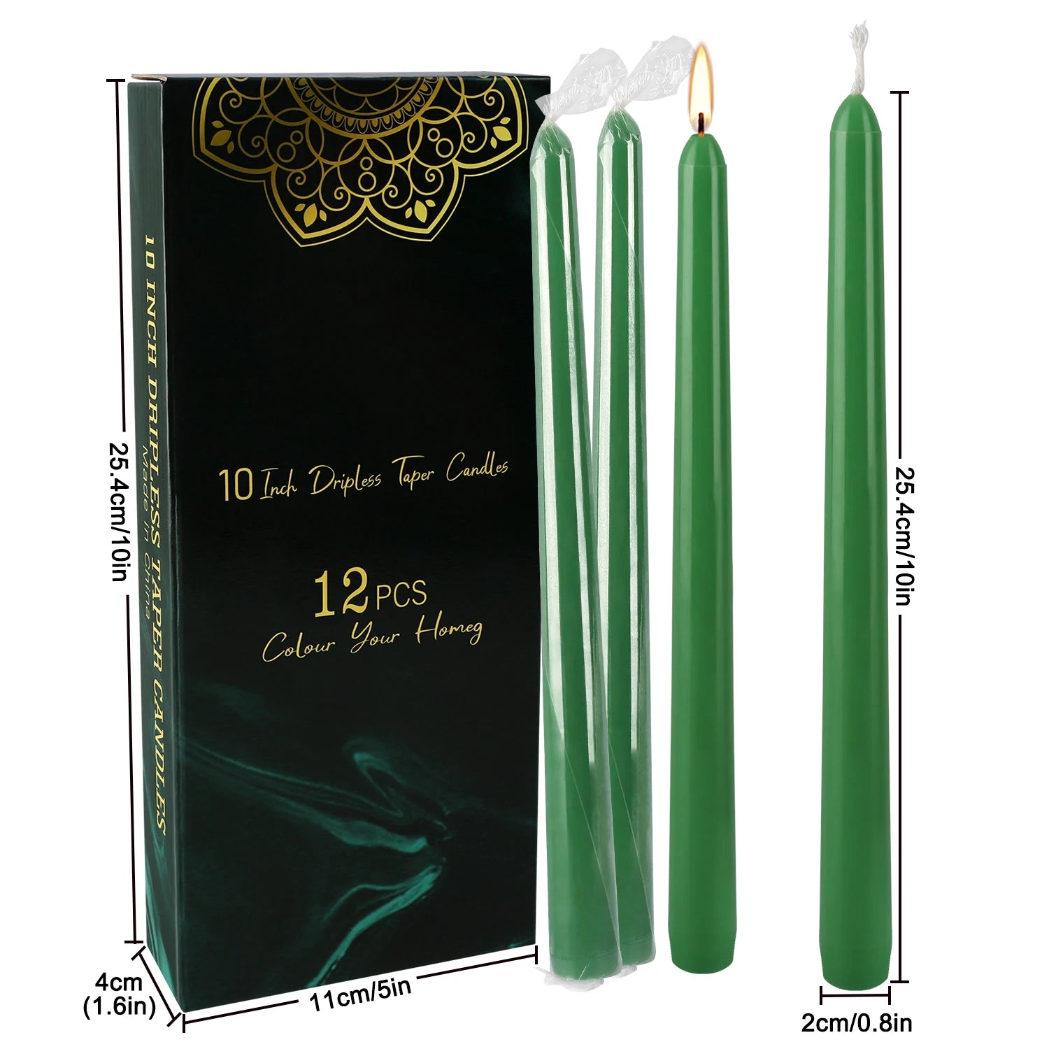 Sublimez vos célébrations et votre intérieur avec ce lot de 12 bougies vertes effilées de 10 pouces. Tirées à la main avec une finition artisanale, elles offrent une flamme propre et sans goutte, idéale pour créer une ambiance raffinée et festive.