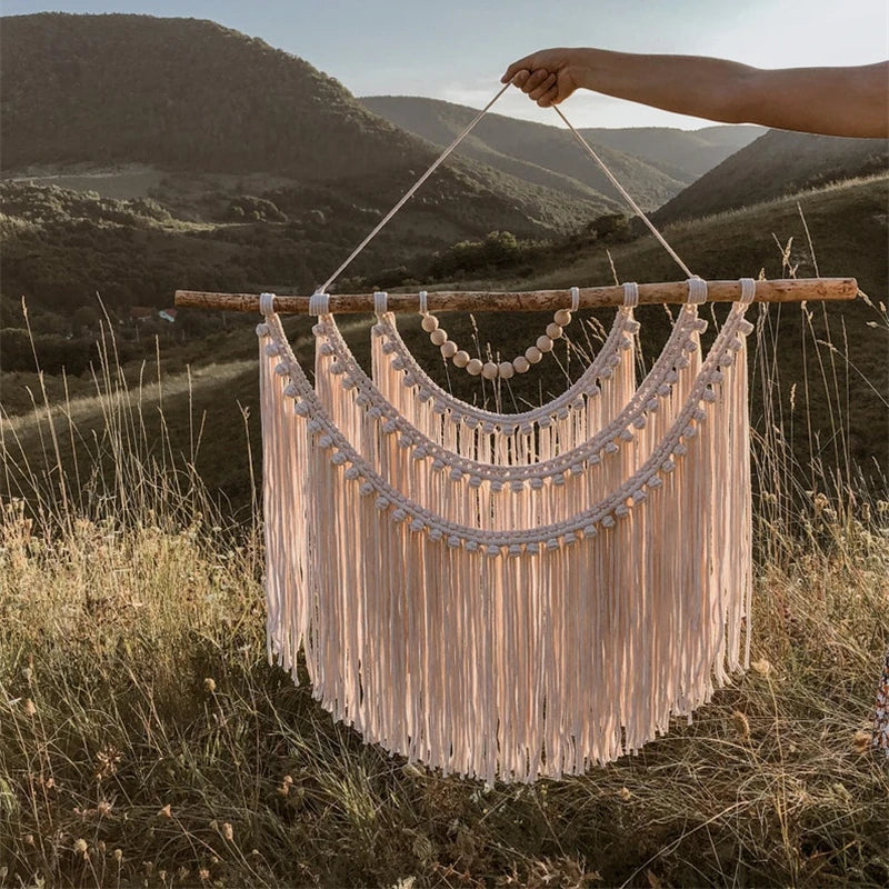 Ajoutez une touche artistique et apaisante à votre intérieur avec cette somptueuse tenture murale en macramé. Fabriquée à la main avec un savoir-faire raffiné, cette pièce tissée dans un style bohème est suspendue à un bâton rond en bois épissé, apportant charme et authenticité à votre décoration. Parfaite comme tête de lit ou ornement mural, elle crée une ambiance chaleureuse et naturelle dans n'importe quelle pièce : chambre, salon ou espace détente.
