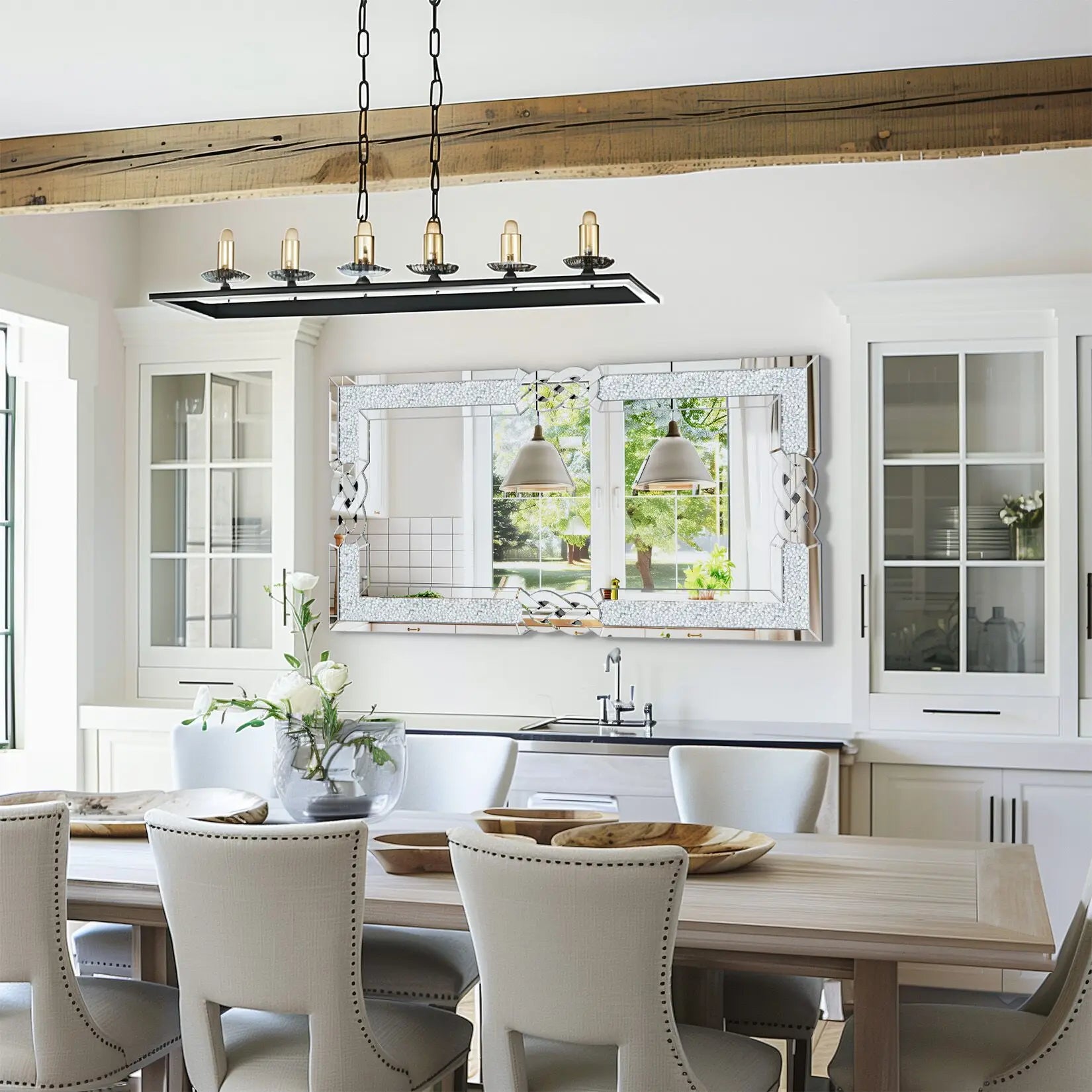 Apportez une touche de luxe et de brillance à votre intérieur avec ce miroir mural rectangulaire. Fabriqué en verre haute définition, il séduit par ses bordures ornées d’incrustations argentées à effet diamant concassé, qui captent magnifiquement la lumière. Son design glamour et raffiné s'intègre parfaitement dans un salon chic, une chambre sophistiquée ou un couloir contemporain. Ce miroir allie fonctionnalité et esthétique, agrandissant visuellement l’espace tout en le magnifiant.