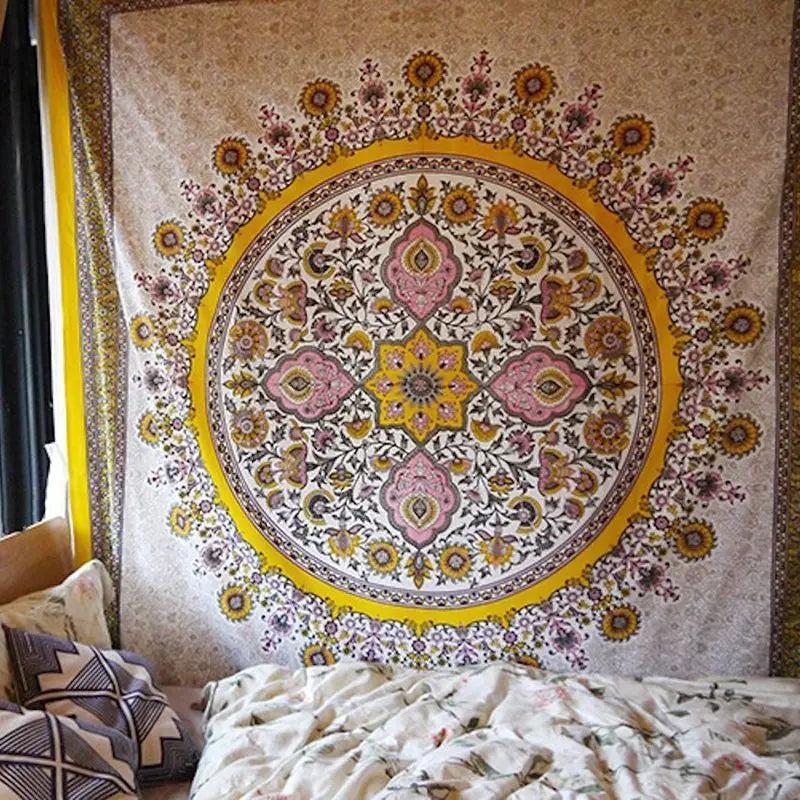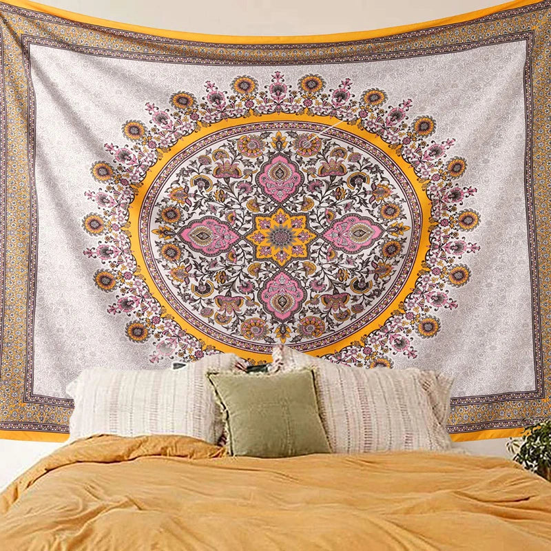 Transformez votre intérieur en un véritable havre de paix avec cette tapisserie murale indienne. Composée d’un médaillon floral doré et d’un motif mandala délicat, elle est sublimée par une touche de macramé céleste. Parfaite en tête de lit, dans un salon bohème ou une chambre zen, elle insuffle spiritualité et élégance à votre décoration.